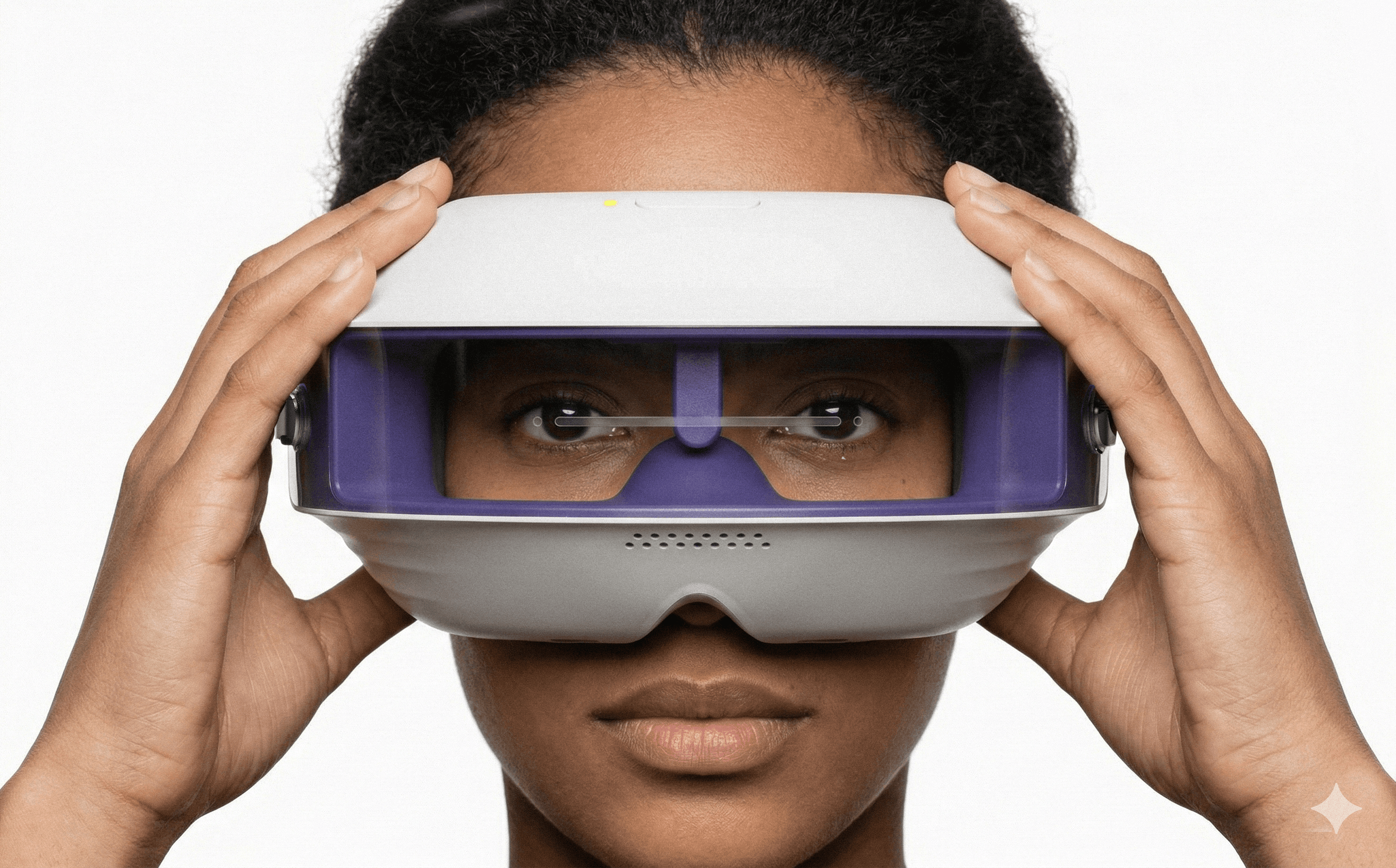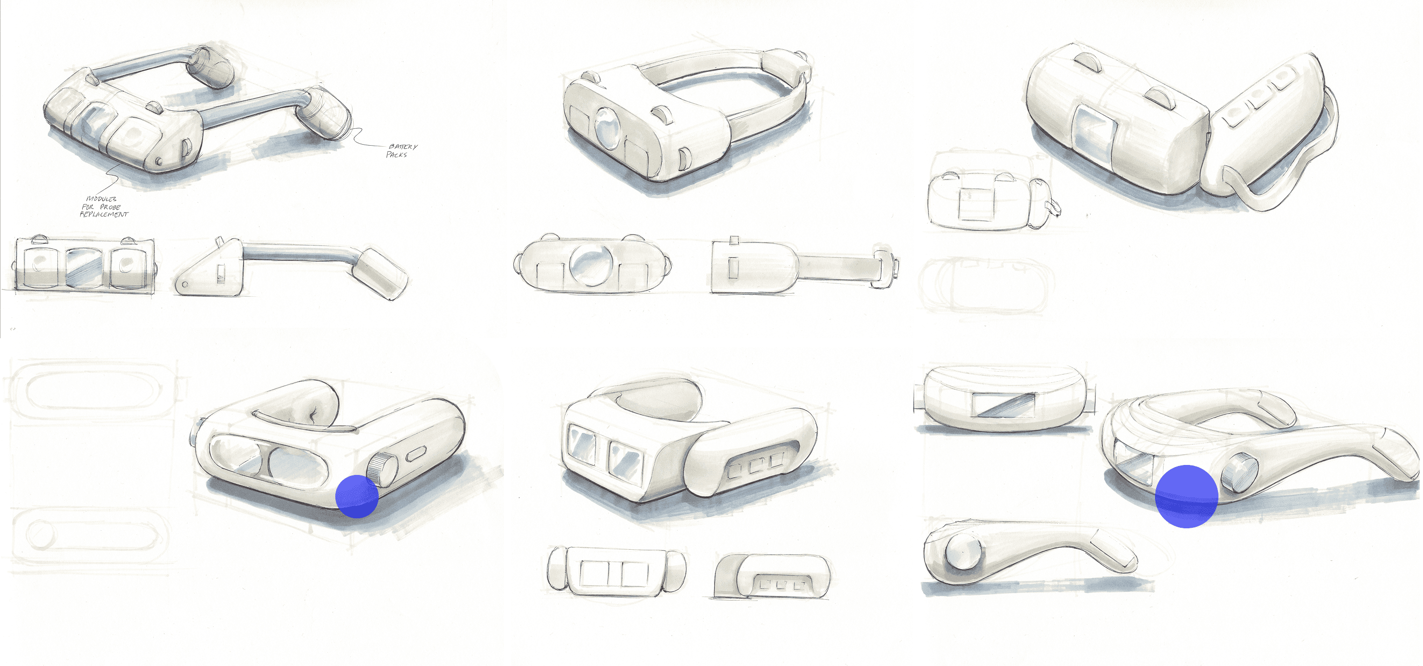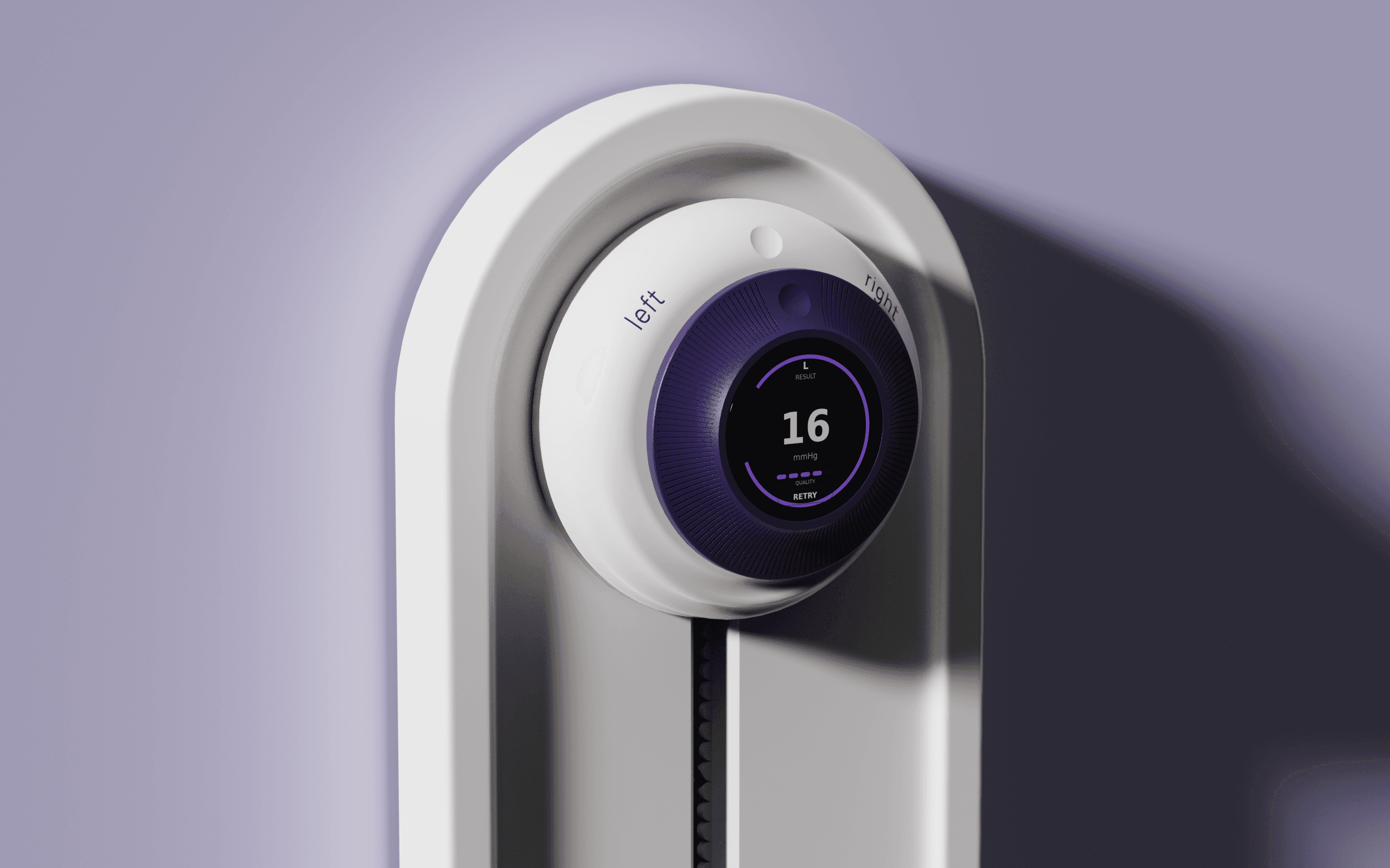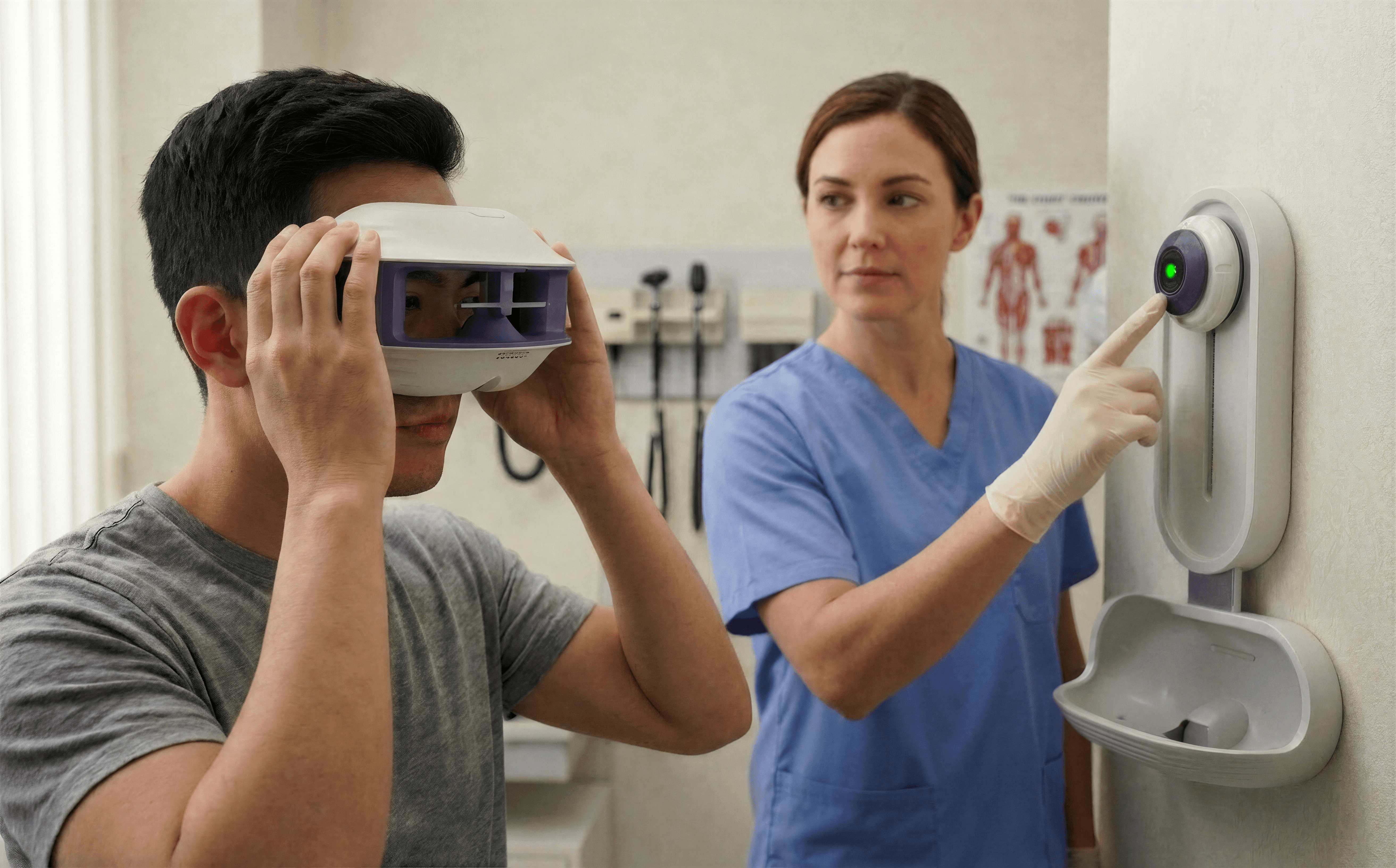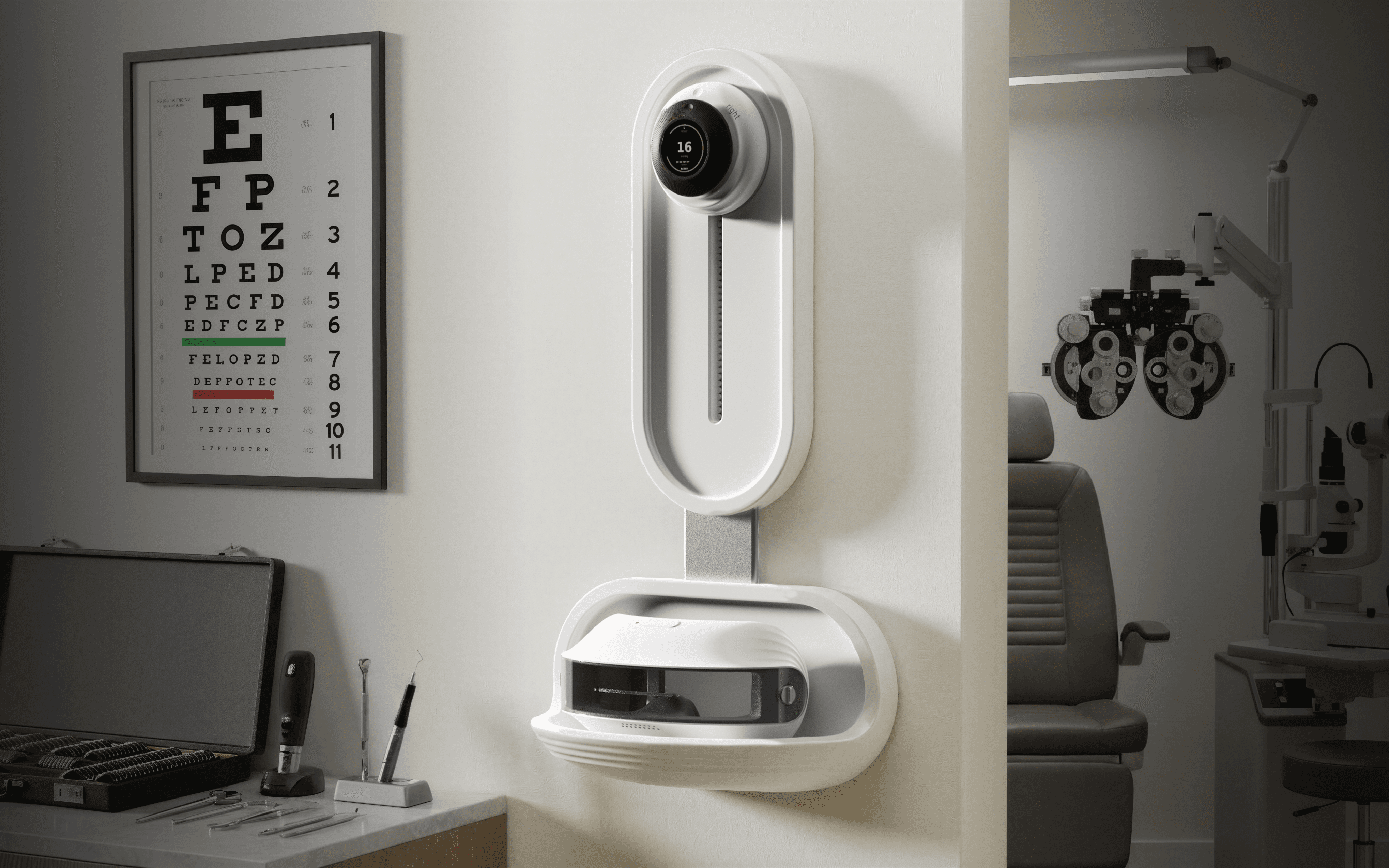 This is a three part system. The headset stabilizes positioning at the face, the puck dial produces results through focusing on it, and the wall mount keeps the kit charged and ready between patients.