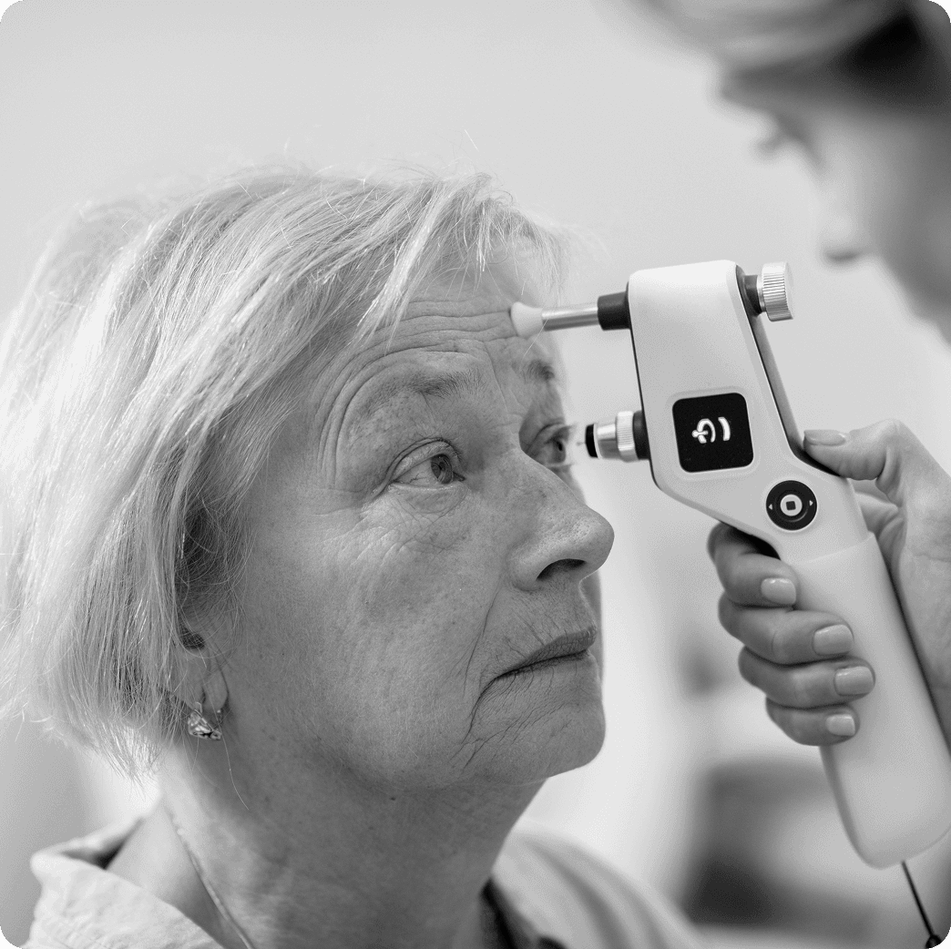 A rebound tonometer estimates IOP by gently tapping the cornea with a tiny disposable probe. The device measures how the probe decelerates and rebounds on contact, then converts that motion into an IOP reading.